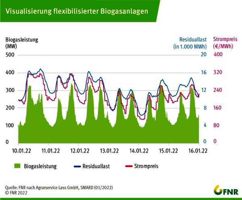 Sonne, Wind und andere fluktuierende erneuerbare Energiequellen erfordern einen stetigen Ausgleich durch individuell regelbare Kraftwerksleistungen. Dass flexibilisierte Biogasanlagen diese Systemleistungen passgenau erbringen, zeigen die Kooperationspartner im Projekt „VisuFlex“. Dazu stellen sie die Stromeinspeisung ausgewählter Biogasanlagen der Residuallast und den Strompreisen gegenüber.