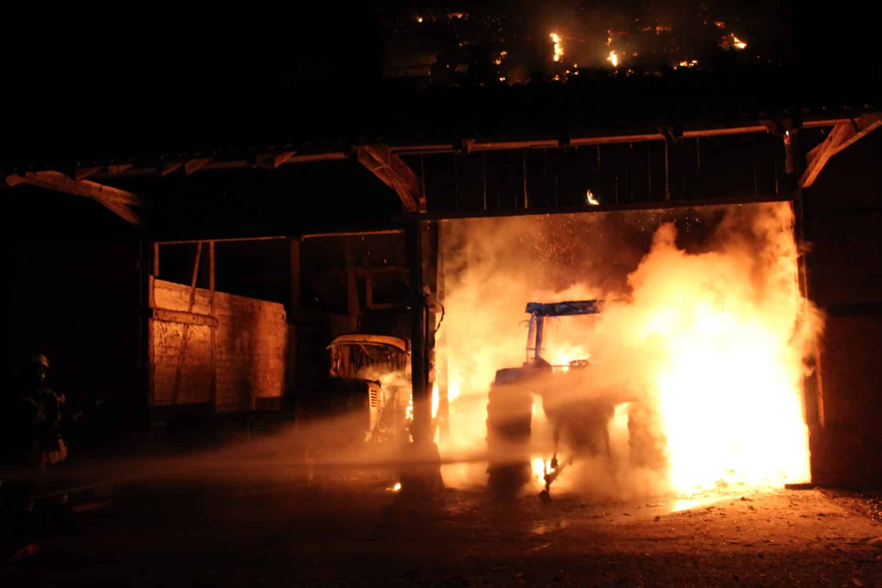 Zwei Traktoren fangen in großem landwirtschaftlichem Gebäude Feuer